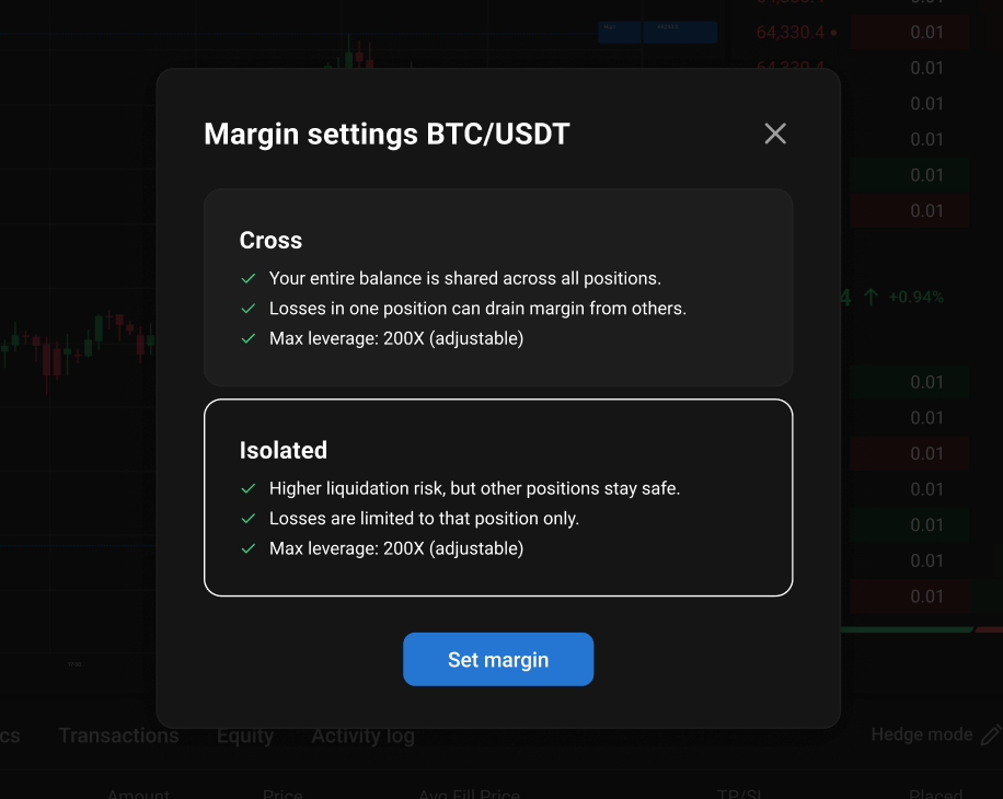 PrimeXBTでは、分離マージンを使用してレバレッジをその場で調整できます。ポジションをオープンした後でも可能です。