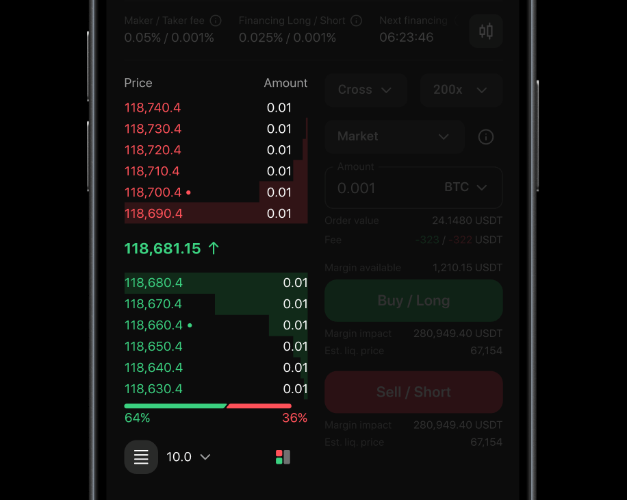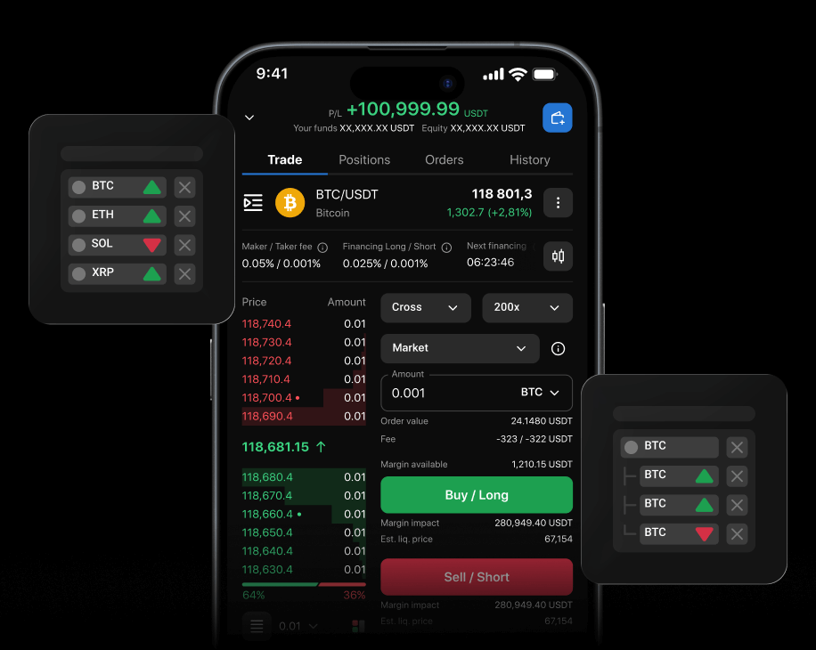 BTC、ETH、SOL、XRPなどの主要市場で取引を開始しましょう。すべて高速約定、豊富な流動性、リアルタイムリスク保護機能を備えています。