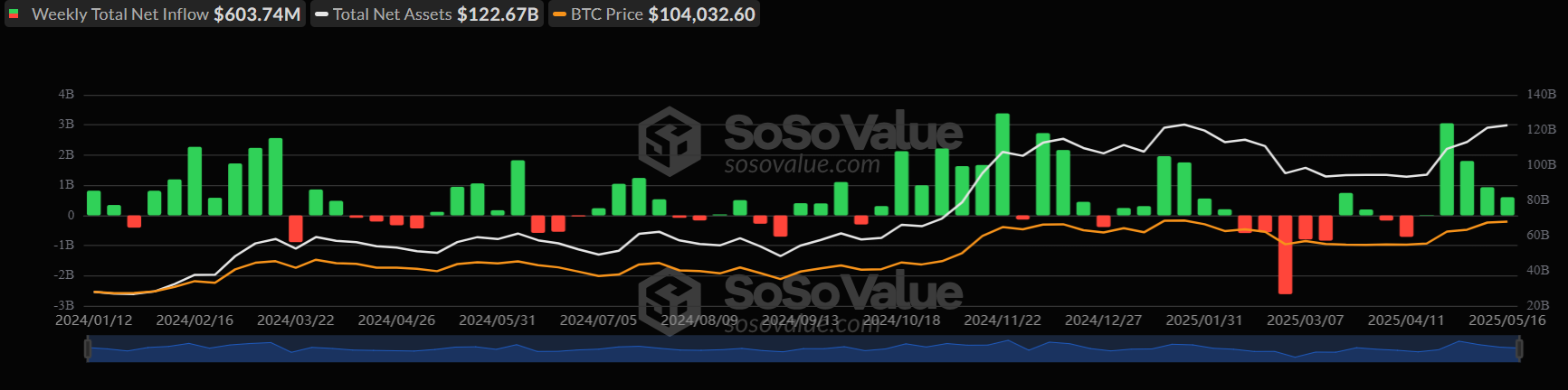 Institutional demand for Bitcoin has remained solid, with Bitcoin ETFs seeing the fifth straight week of net inflows. According to SoSo Value BTC ETF data, net inflows reached $603.74 million last week, putting total monthly ETFs’ inflows at $2.64 billion following $2.97 billion in net inflows in April. Persistent BTC ETF inflows could lift Bitcoin’s price higher.