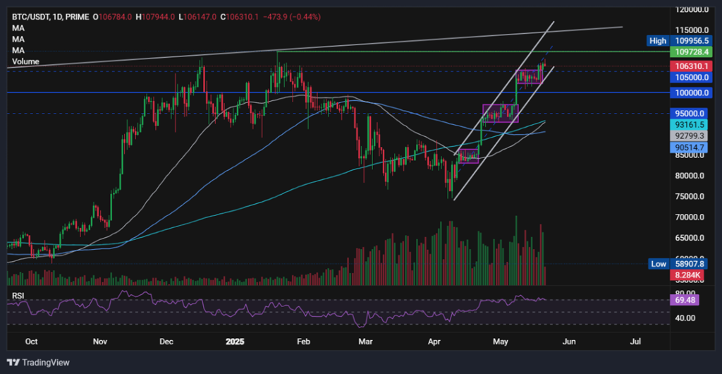 Bitcoin has risen to within 1% of its 109.5k record high, as investors look for protection from global uncertainty. Over the past six weeks, Bitcoin has jumped almost 40% and has remained above the key 100K psychological level for the past 11 days.